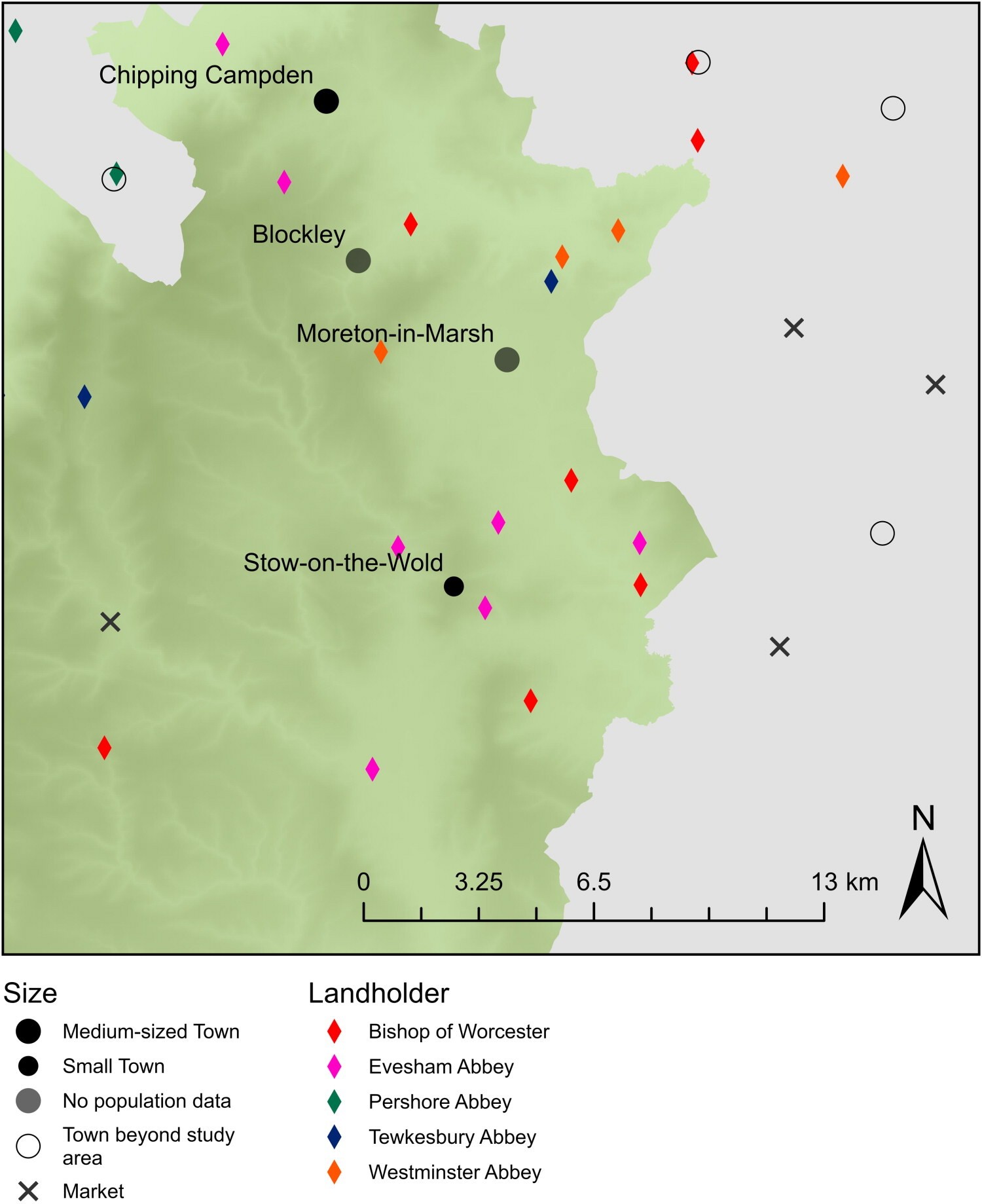 Map showing the relationship of Cotswold towns to institutional landholding in 1086. Drawing by author.